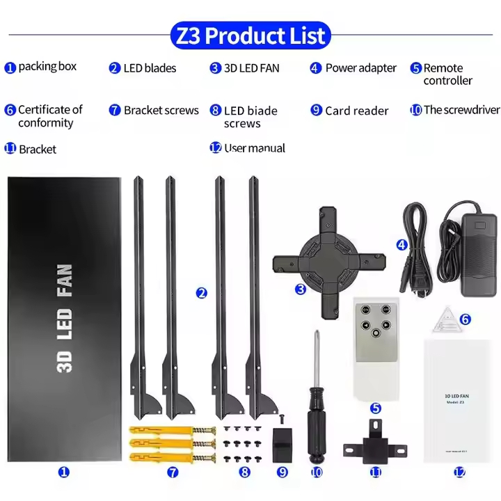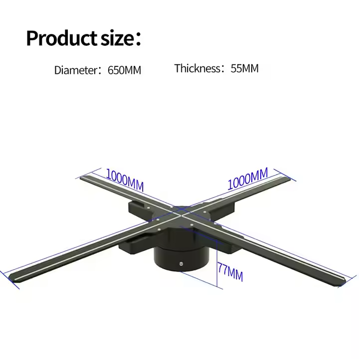 Wentylator z hologramem 3D o średnicy 100 cm, wykorzystujący opatentowane elementy emitujące światło, o wysokiej jasności. Treści reklamowe Hologram Fan mogą obsługiwać majsterkowanie, profesjonalne algorytmy, konwersję jednym kliknięciem w formacie 3D, połączenie WIFI, kontrolę aplikacji, wygodnie i szybko.